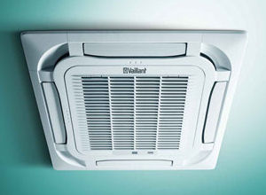 Équipement d'air conditionné, système air-air split 1x1, pour gaz R-32, pompe à chaleur, alimentation monophasée (230V/50Hz), modèle climaVAIR plus VAI 1 050 KN "VAILLANT", puissance frigorifique nominale 5 kW, puissance frigorifique minimale/maximale 1,6/5,5 kW, consommation électrique en refroidissement 1,56 kW, SEER 5,9 (classe A+), puissance calorifique nominale 5,5 kW, puissance calorifique minimale/maximale 1,5/6 kW, consommation électrique en chauffage 1,65 kW, SCOP 4 (classe A+), constitué d'une unité intérieure à cassette VAI 1-050 KNI, pression sonore minimale/maximale 33/44 dBA, dimensions 265x570x570 mm, poids 17 kg, panneau de dimensions du panneau 47,5x620x620 mm avec grille VAI1-60 PNI, prise d'air extérieur, télécommande, et une unité extérieure VAI 1-050 KDNO, avec compresseur type Inverter DC, pression sonore 53 dBA, dimensions 596x818x302 mm, poids 39 kg, diamètre de connexion du tuyau de gaz 1/2", diamètre de connexion du tuyau de liquide 1/4", avec amortisseurs de ressorts, supports et fixations des unités intérieures et des unités extérieures, tuyauterie d'évacuation avec siphon, connexion frigorifique entre les unités, connexion électrique entre les unités, fixation et protection mécanique des lignes étendues et cachées sous goulotte à couvercle aux zones apparentes. Comprend les éléments antivibratoires et les supports de paroi pour l'appui de l'unité extérieure et éléments pour la suspension au plafond de l'unité intérieure.